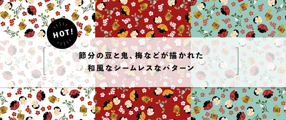 節分の豆と鬼、梅などが描かれた和風なシームレスなパターン。背景の他にもテキスタイルや包装紙におすすめです。 ホワイト、レッド、ブルーの3色セット。 それぞれAI形式、EPS形式、JPEG形式のファイルを収録しています。 ---------------------------------------- 【商品情報】 ●ファイル形式:AI形式 EPS形式 JPEG形式 ●収録点数:9点 ●商用利用可 ---------------------------------------- ※データは圧縮しておりますので解凍してご利用下さい。